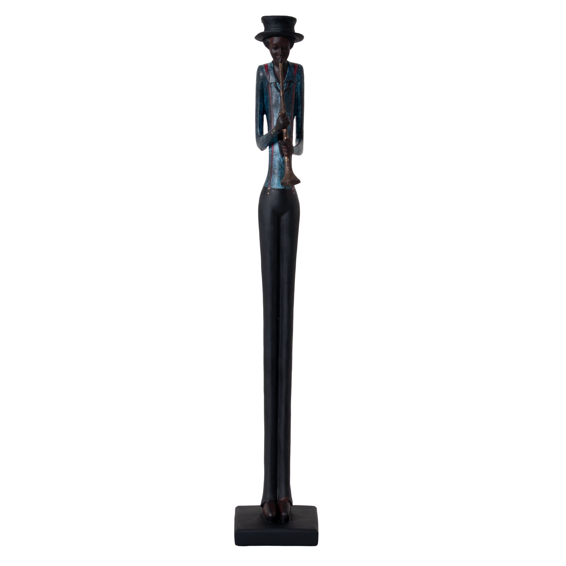 Bring the smooth sounds of jazz to your collection with this striking contemporary sculpture of a saxophonist in full swing. Standing at an impressive height, this elegant figurine captures the essence of musical artistry with its elongated silhouette and rich metallic finish in bronze and gold tones. The musician's stance exudes confidence and style, from the carefully detailed instrument to the sophisticated attire complete with a dapper hat. The slender, modernist design makes this piece a perfect statement accent for luxury hospitality spaces, music rooms, or contemporary living areas. Style alongside other pieces from the Jazz Band collection to create an engaging musical ensemble, or let it stand alone as a dramatic focal point. The versatile aesthetic complements both art deco inspired interiors and modern minimalist spaces. Perfect for retailers catering to design-conscious customers seeking distinctive decorative pieces with artistic flair. This timeless piece appeals to music lovers and interior design enthusiasts alike, offering excellent margins and proven sales performance in upscale home décor settings. Pair with metallic accessories, geometric patterns, and mood lighting to create captivating visual merchandising displays that will draw customers in and drive sales.